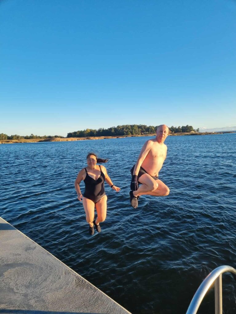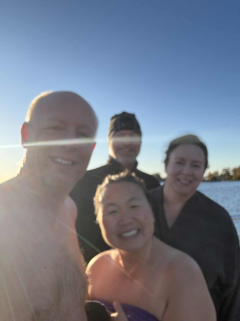 Lördagsmorgonen började med ett kallt men uppfriskande bad. Jag hoppade över både löpning och promenad – foten gör fortfarande ont efter cykelvurpan. Det var två grader i luften, lite blåsigt och 10,3 grader i vattnet. En sån där morgon när man känner sig både galen och levande på samma gång.