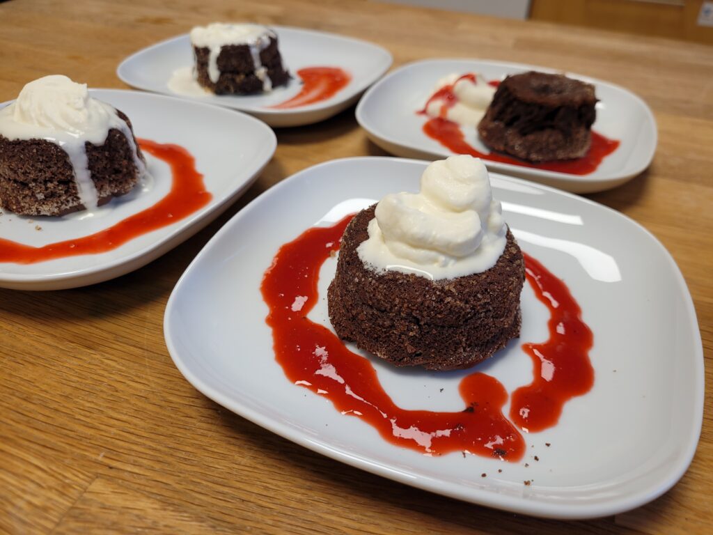 I natt har det kommit typ en centimeters snö så Mats fick skotta bort det tunna lagret innan vi kunde åka till jobbet. Det har som vanligt varit en bra dag och idag har eleverna gjort chokladfondant. Det var första gången för mig och ingen utav eleverna hade gjort det. Det blev gott med en hallonspegel till och vispgrädde. De blev lite torra för mitten var inte rinnande. Imorgon blir det samma med en annan grupp och då kanske fondanterna blir perfekta.