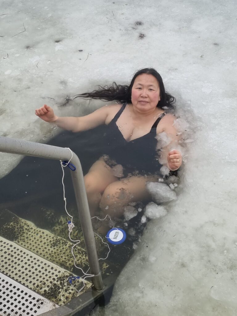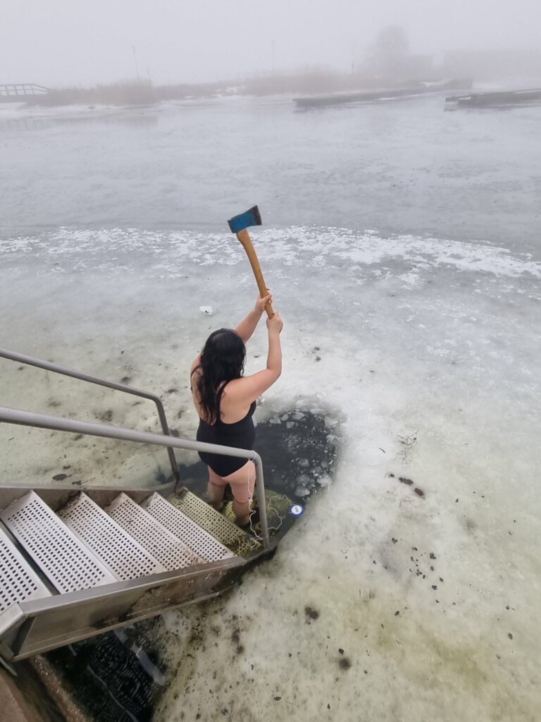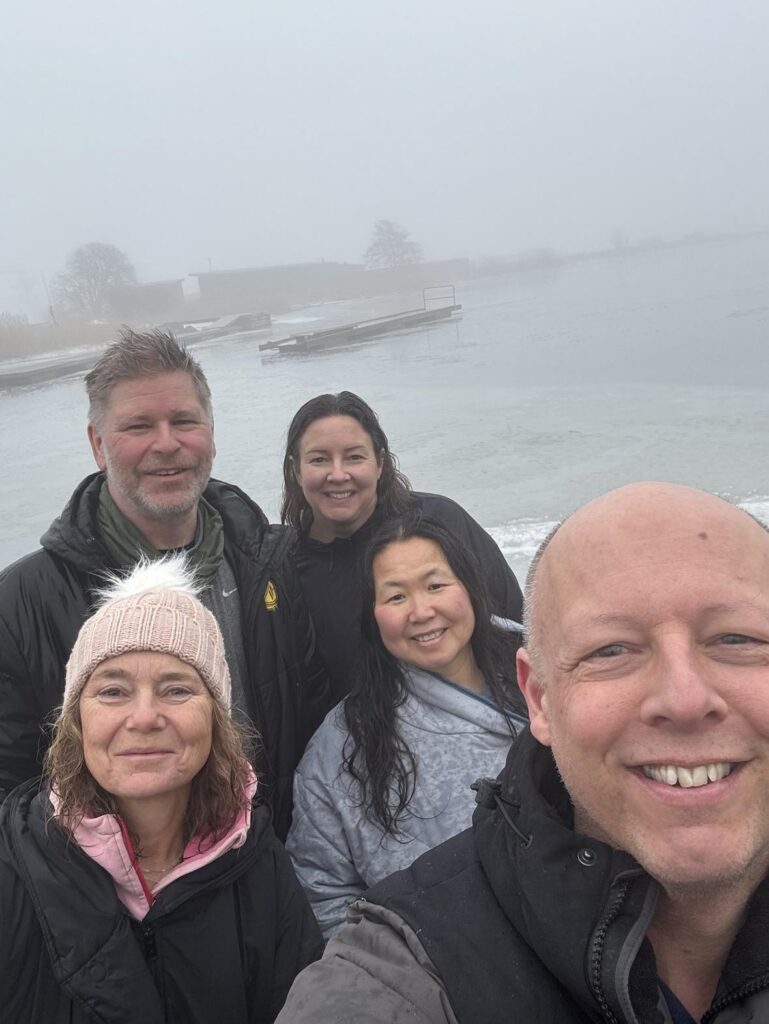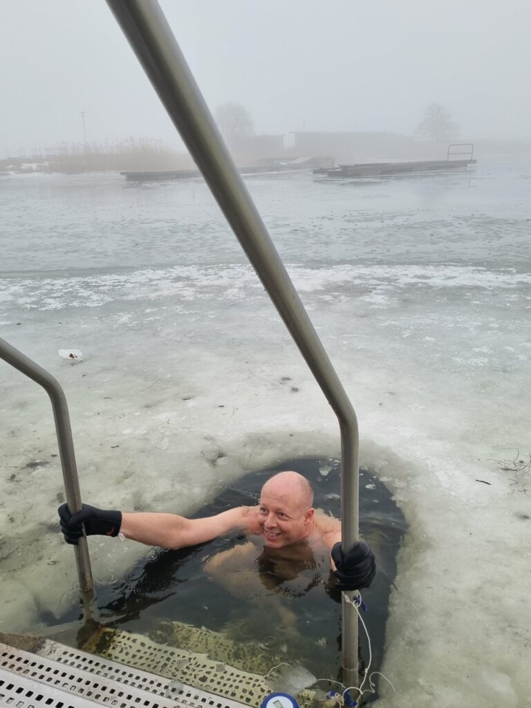 Sedan blev det en lugn fredagskväll hemma i soffan. På lördagsmorgonen bytte vi ställe för vårt lördagsbad då det är så lite vatten vid stegen vid Norrlidsbastun. Den här morgonen var en regnig och grå sådan men det blev bad vid långviken. Mats och Jimmy sprang medans jag, Marie och Maria gick en promenad. I luften var det 4 grader och 0 grader i vattnet.