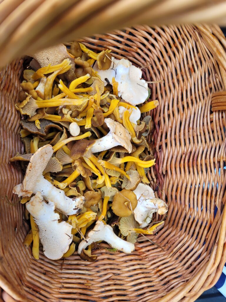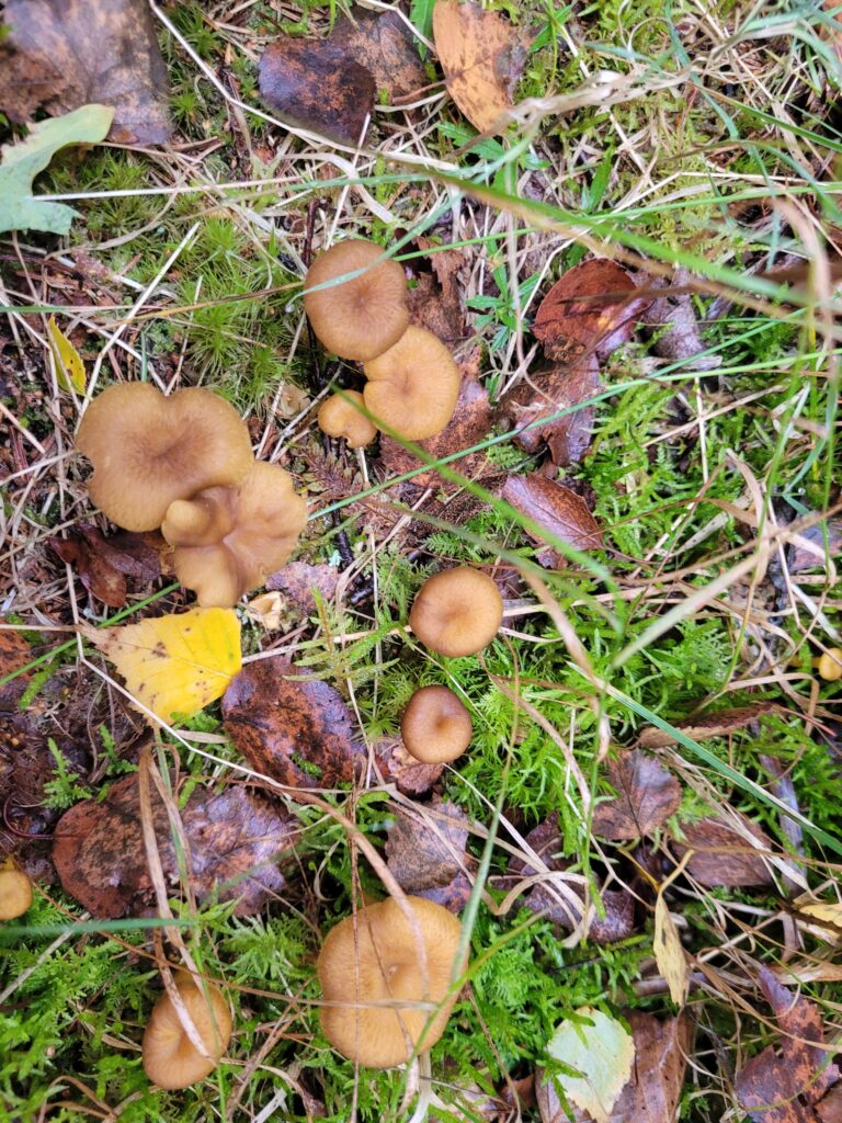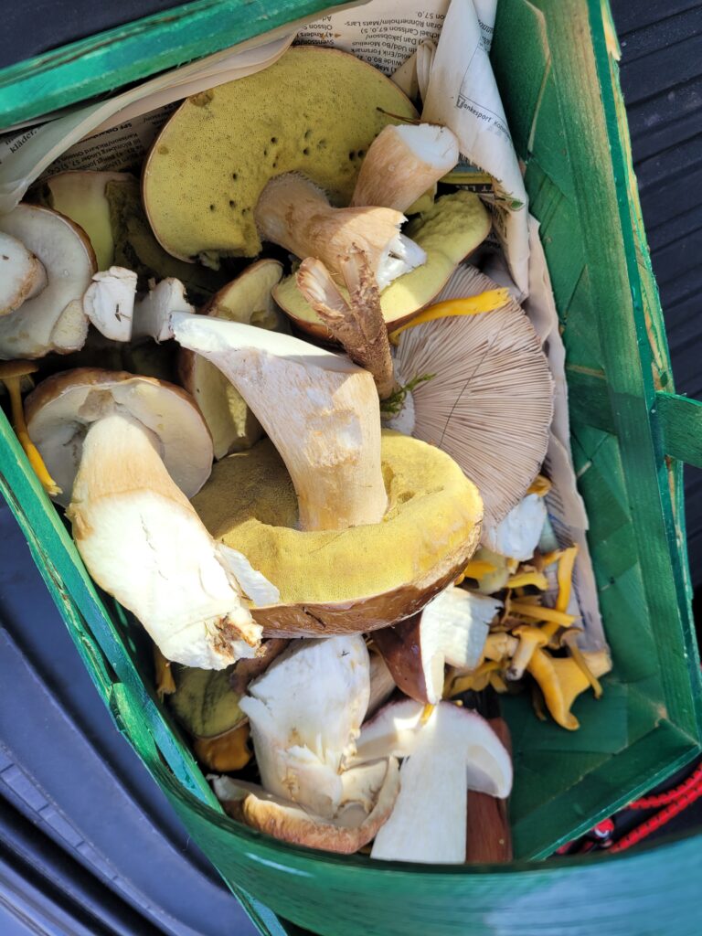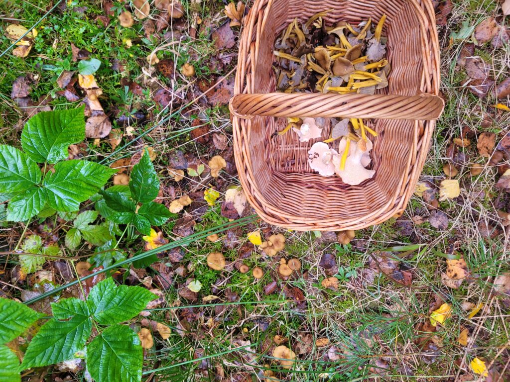 Vid ett-tiden åkte vi hem igen och då passade jag på att vila lite. Sedan kom dottern och hämtade upp oss för en liten tur i skogen. Vi skulle se om vi hittade några kantareller och det gjorde vi. Inte så mycket men det räckte till svampsmörgåsar ikväll. Det var så gott. Trattkantarellerna var rätt små så några behöver nog någon vecka till för att växa till sig.