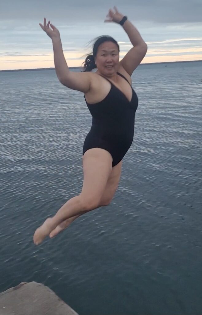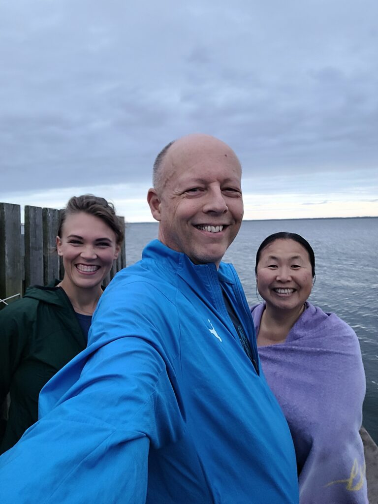 När Mats kom hem strax innan 17 bytte vi om och körde till Långviken där vi träffade Madeleine. Jag provade att gå men fick ont i mitt knä. Jag gick en kortare runda medans Mats och Madeleine sprang. Därefter badade jag, de andra hoppade över badet ikväll. Det 14 grader i kuften och 12,5 grader i vattnet.